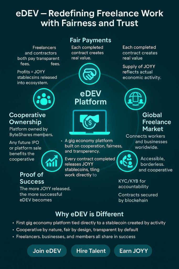 eDEV is the culmination of years of pioneering work, lessons learned, and a commitment to fairness. It represents the next stage of the gig economy: transparent, cooperative, and human-centered.